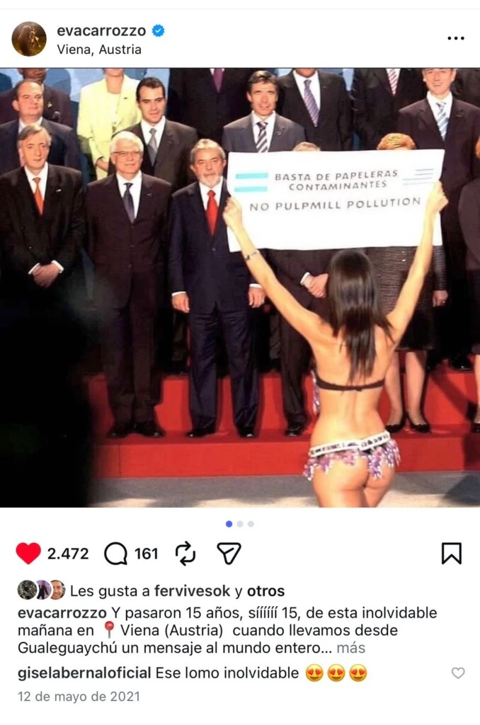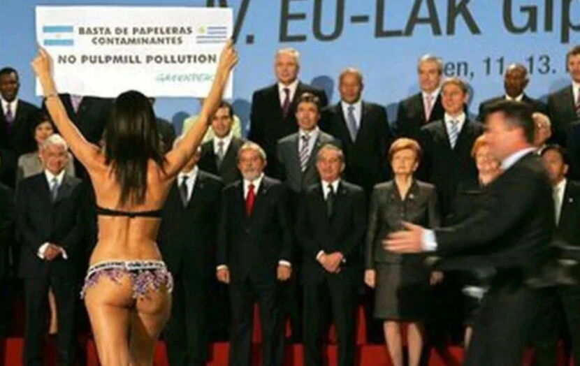 Con muy poca ropa y sosteniendo bien alto una pancarta con la inscripción "Basta de papeleras contaminantes” -escrito en español y en inglés-, Evangelina Carrozzo irrumpió en la cumbre de Viena, Austria. Lo hizo de frente a 58 jefes de Estado (con Néstor Kirchner, Lula da Silva y Angela Merkel en primera fila) y de espaldas a las cámaras. Y entonces, ese 12 de mayo de 2006 el mundo se detuvo.