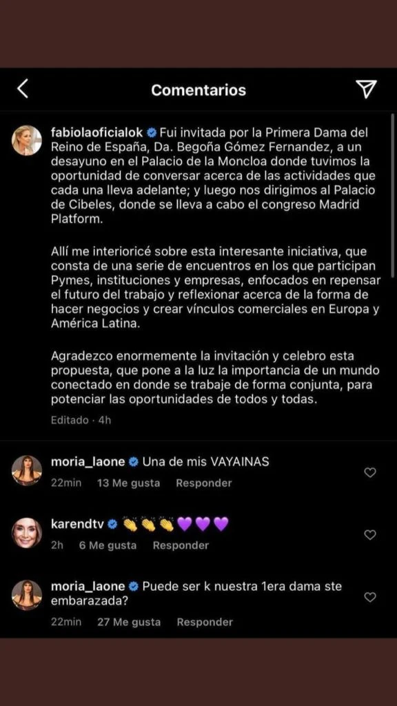 “Fui invitada por la Primera Dama del Reino de España, Da. Begoña Gómez Fernández, a un desayuno en el Palacio de la Moncloa donde tuvimos la oportunidad de conversar acerca de las actividades que cada una lleva adelante; y luego nos dirigimos al Palacio de Cibeles, donde se lleva a cabo el congreso Madrid Platform”, escribió en su red social Fabiola.