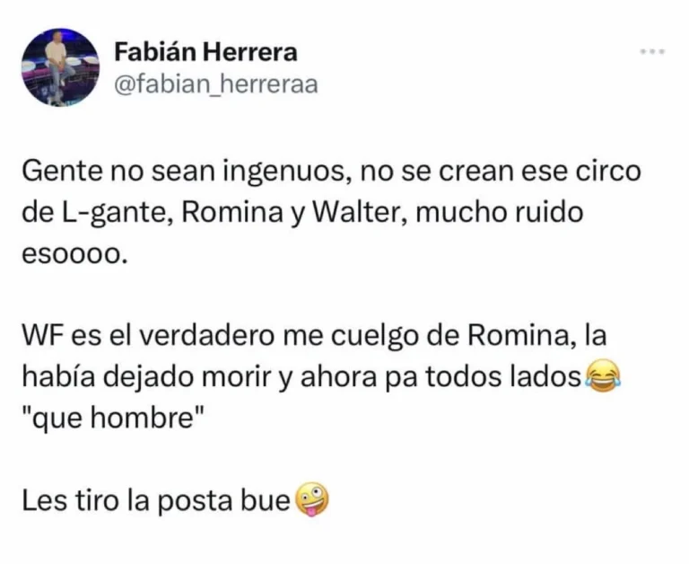 Y sumó: “WF es el verdadero me cuelgo de Romina, la había dejado morir y ahora pa todos lados ‘que hombre’”.
