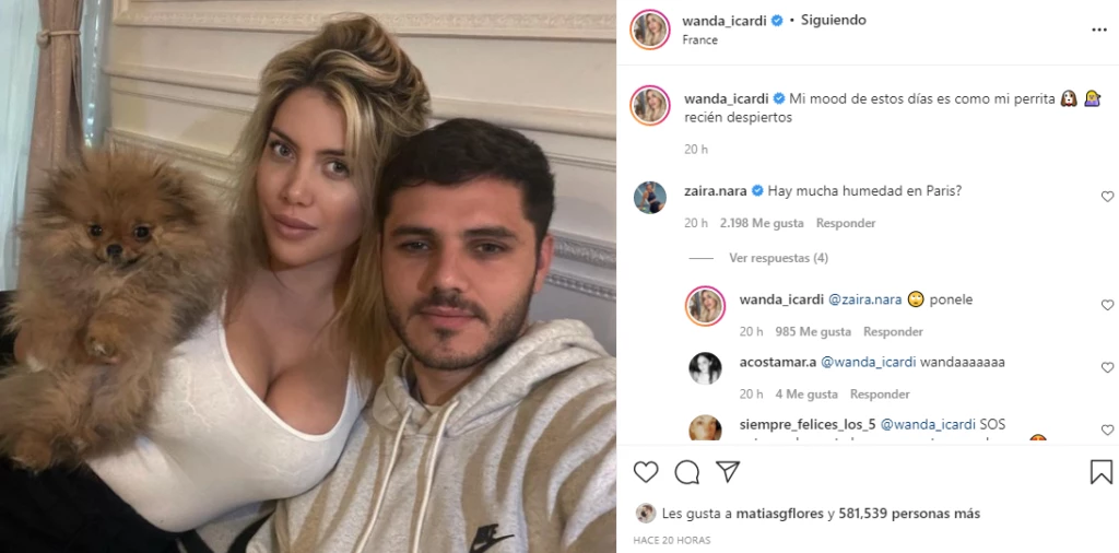 En las últimas horas, Wanda compartió una foto junto a Mauro y su nueva mascota y el comentario de Zaira no pasó desapercibido: "¿Hay mucha humedad en París?", preguntó. "Ponele", respondió Wanda.