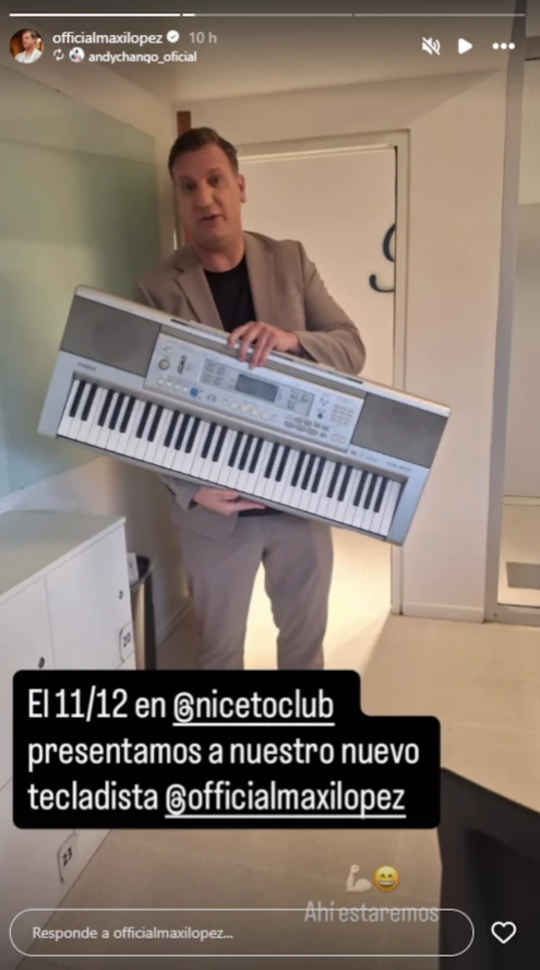 La historia comenzó con un posteo de Andy Chango, músico y compañero de certamen, quien compartió en sus redes una imagen que descolocó a todos: Maxi, elegante, sosteniendo un teclado eléctrico. Y el anuncio que acompañó la foto terminó de confirmar el misterio: “El 11 de diciembre presentamos a nuestro nuevo tecladista, Maxi López”.
