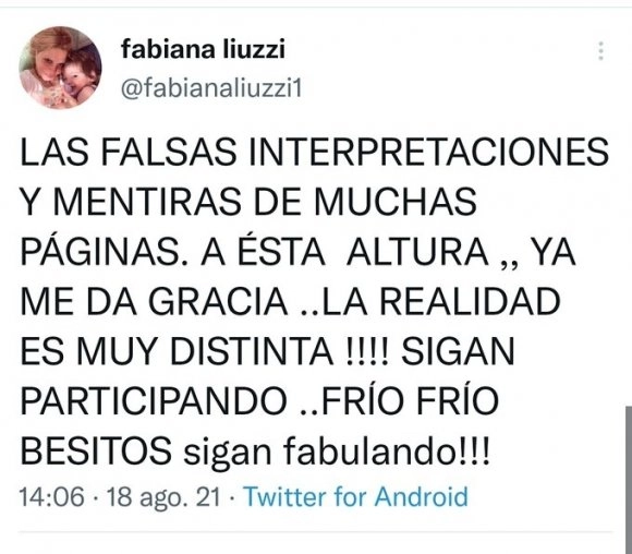 Liuzzi escribió en su posteo: "Las falsas interpretaciones y mentiras de muchas páginas, a esta altura, ya me dan gracia. La realidad es muy distinta. Sigan participando. Frío, frío. Besitos, sigan fabulando". No queda claro y abre el campo a diversas deducciones.