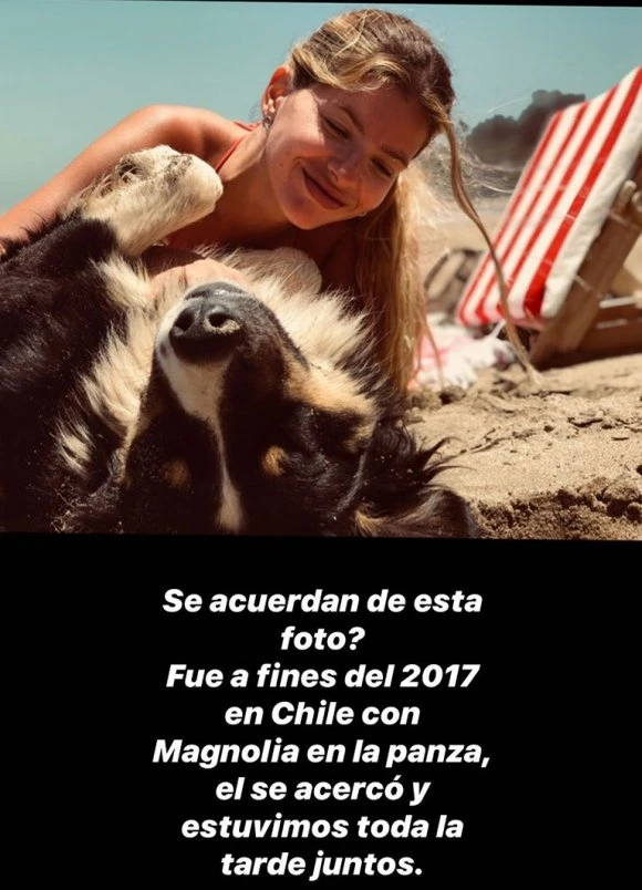 En la imagen que publicó se la ve embarazada de Magnolia y jugando con un perrito en la playa. Al pie escribió: “¿Se acuerdan de esta foto? Fue a fines del 2017 en Chile con Magnolia en la panza, él se acercó y estuvimos toda la tarde juntos”.