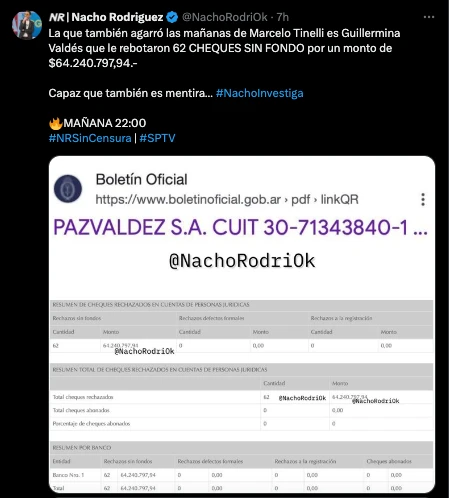 “La que también agarró las mañanas de Marcelo Tinelli es Guillermina Valdés que le rebotaron 62 CHEQUES SIN FONDO por un monto de $64.240.797,94”, escribió el periodista, mostrando un resumen de las cuentas de Guillermina. Una situación que deja muy mal parada a la famosa, que todavía no salió a blanquear esta situación públicamente.