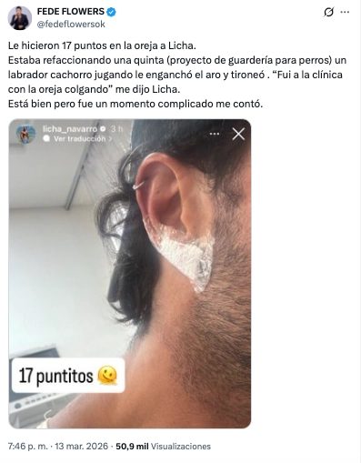 “Le hicieron 17 puntos en la oreja a Licha. Estaba refaccionando una quinta (proyecto de guardería para perros), y un labrador cachorro jugando le enganchó el aro y tironeó. ‘Fui a la clínica con la oreja colgando’, me dijo Licha. Está bien, pero fue un momento complicado”, contó el periodista sobre el dramático momento que pasó Navarro por estas horas.