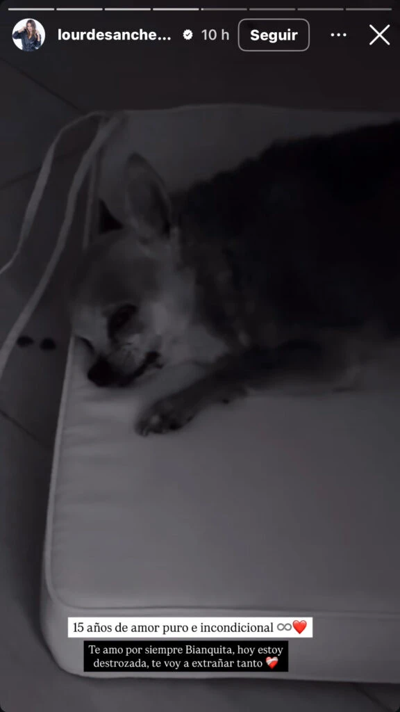 ”15 años de amor puro e incondicional. Te amo para siempre Bianquita, hoy estoy destrozada. Te voy a extrañar tanto”, escribió Lourdes Sánchez en la publicación que compartió en sus redes sociales donde recopiló los momentos más lindos con su perrita a lo largo de los años.