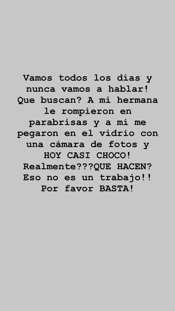 Y agregó: “Vamos todos los días y nunca vamos a hablar. ¿Qué buscan? A mi hermana le rompieron el parabrisas y a mí me pegaron en el vidrio con una cámara de fotos. ¡Y hoy casi choco! ¿Realmente? ¿Qué hacen? Ese no es un trabajo. Por favor, ¡basta!”