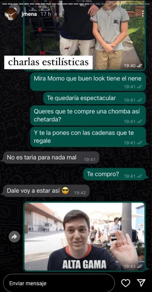 En su Instagram Jimena posteó un screen del chat con Momo donde le ofrece comprarle una chomba para hacer las pases. "Mirá Momo que buen look. Te quedaría espectacular. ¿Querés que te compre una chomba así chetarda? Y te la pones con las cadenas que te regale?". Emocionado accedió y todo volvió a la normalidad.