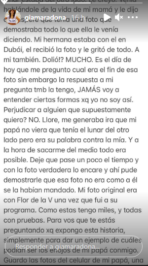 "Me pregunto ¿qué pasaría si a mi realmente me afectara psíquicamente todo lo que están diciendo de mi familia? Si realmente esos dedos acusadores me derrumbaran, si las injurias hacia mi persona me afectarían ya que soy una caca de ser humano culpable hasta de si hace frío/calor para los comunicadores de la TV. ¿Qué tendría que hacer? ¿Caigo en un pozo depresivo? ¿Me empastillo? ¿Agarro alguna adicción? ¿Me suicido? Todas serían posibles si me afectaría de verdad que 24/7 estén hablando de la muerte de mi papá, sí, porque es Maradona pero también es mi papá, un abuelo, un hermano, un tío, un ser humano", manifestó.