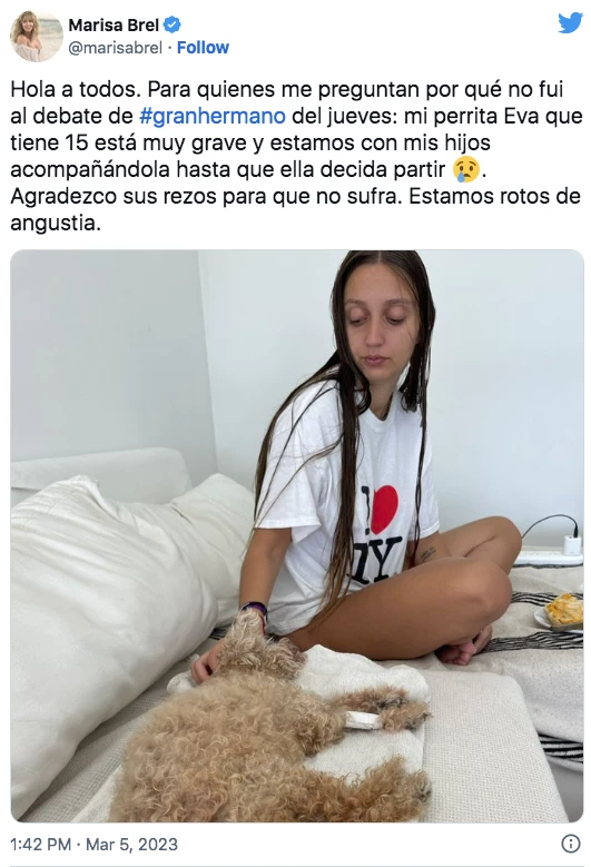 "Hola a todos. Para quienes me preguntan por qué no fui al debate de #GranHermano del jueves: mi perrita Eva que tiene 15 años está muy grave y estamos con mis hijos acompañándola hasta que ella decida partir . Agradezco sus rezos para que no sufra. Estamos rotos de angustia", compartió Marisa, quien suele tener picantes entredichos con su compañera de panel, Laura Ubfal, desde su cuenta oficial de Twitter.