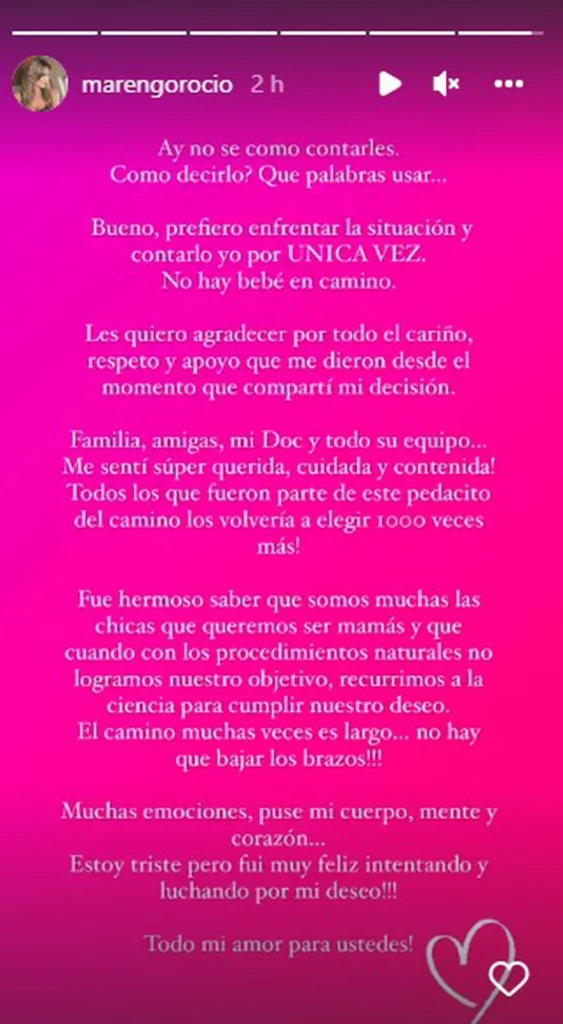 Rocío Marengo agregó a su duro comunicado: “Fue hermoso saber que somos muchas las chicas que queremos ser mamás y que cuando con los procedimientos naturales no logramos nuestro objetivo, recurrimos a la ciencia para cumplir nuestro deseo".
