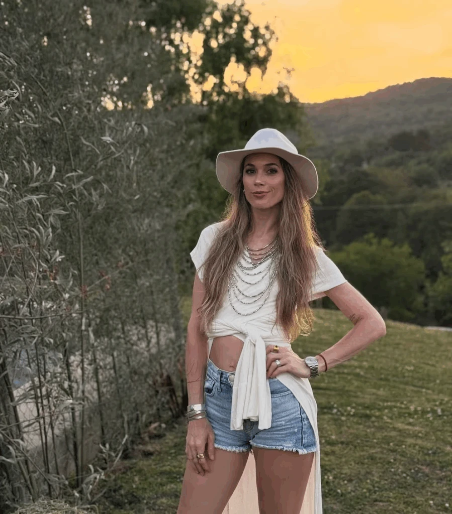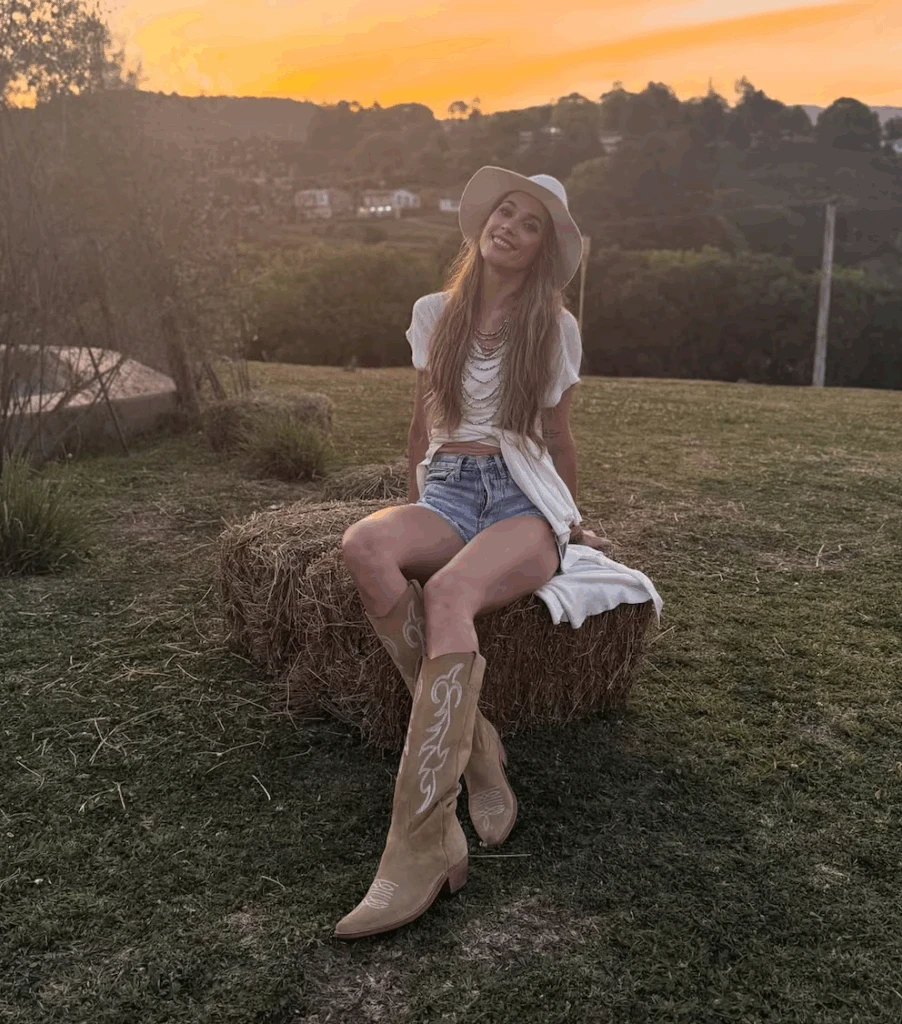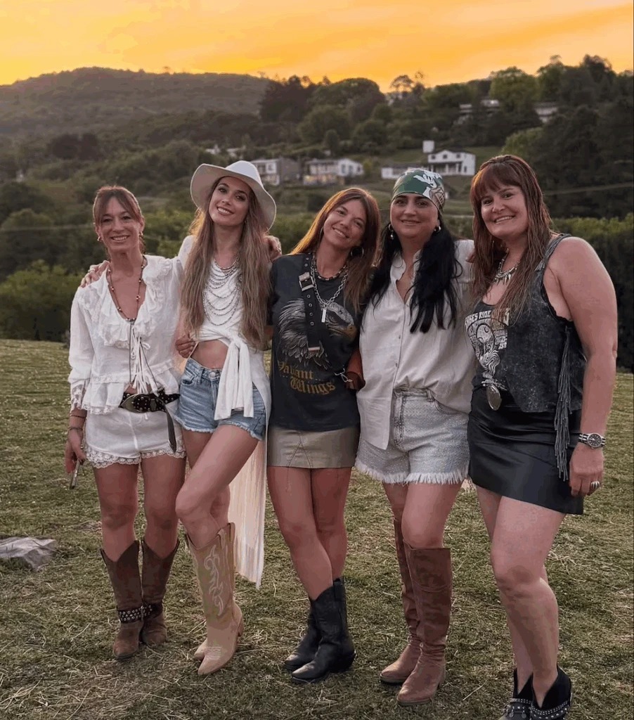 Durante su estadía, Bonelli se mostró rodeada de amigas, risas y atardeceres que parecían pintados. En una de las postales más comentadas, posó sobre el césped con un grupo de mujeres vestidas con estilo country, entre botas tejanas y sombreros, bajo un cielo teñido de naranja.