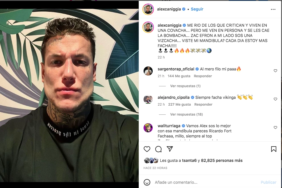 Lejos de apagicuar su emoción, Alex volvió a saltar a las redes sociales para compartir uno de sus mensajes, que suelen cargarse de declaraciones rayanas a frases hirientes, y se sacó una foto de su nueva cara. “Me río de los que critican y viven en una covacha”, arrancó.