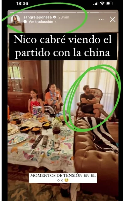 En un fragmento aparece Nicolás sentado, muy concentrado en un tramo del juego en que el combinado nacional no podía quebrar el empate y se complicaba su clasificación a la siguiente instancia del torneo. Ese instante lo detectó Juariu, quien escribió: “Nico Cabré viendo el partido con la China Suárez”.