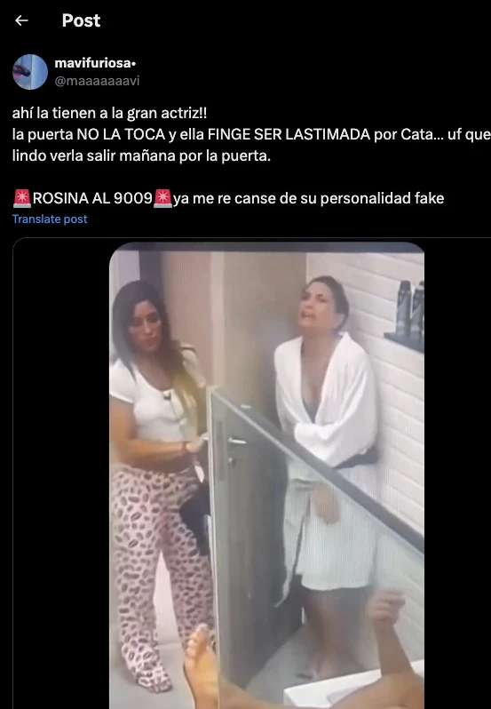 "Ahí la tienen a la gran actriz. La puerta no la toca y ella finge ser lastimada por Cata. Uf qué lindo verla salir mañana por la puerta. Rosina al 9009, ya me cansé de su personalidad fake", fue uno de los comentarios que acumuló Rosina, su contra, después del "mentiroso" episodio.