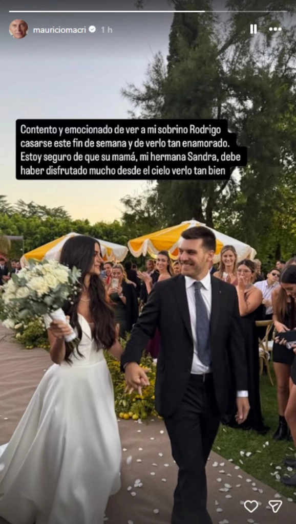 “Contento y emocionado de ver a mi sobrino Rodrigo casarse este fin de semana y de verlo tan enamorado”, escribió junto a una imagen de los recién casados. En el mismo mensaje, Macri recordó a su hermana Sandra Macri, madre del novio, quien falleció en 2014. “Estoy seguro de que la mamá de mi sobrino, mi hermana Sandra, debe haber disfrutado mucho desde el cielo verlo tan bien”, expresó.