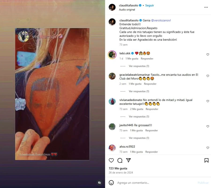 Claudia explicó el motivo del tatuaje: “Es por gratitud, él me salvó cuando yo estaba en la lona”. Aclaró que no lo hizo por fama ni para llamar la atención: “Todos mis tatuajes tienen un sentido muy especial”. Eso no fue todo porque emocionó a todos al confesar: “Lo siento como familia”.