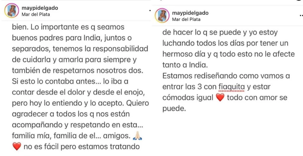 “Yo la estaba pasando bastante mal y él obvio también, porque su idea nunca fue hacerme daño. Hoy ya separados lo entiendo, y entiendo que este fue el gran sueño de mi vida y no era lo mismo para él. Es muy difícil la decisión de ser padres separados, y tampoco ni él ni yo sabemos si esto va a ser así siempre... pero hoy es lo mejor. Me vine a vivir a Mardel porque es donde tengo mi familia, amigas, mi gente y mi depto chiquito que alquilo”, cerró Delgado.