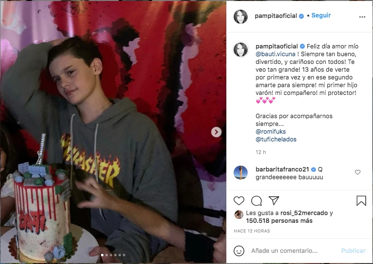 La modelo le escribió al primero de sus herederos, fruto de su relación con Benjamín Vicuña: “Feliz día amor mío. Siempre tan bueno, divertido, y cariñoso con todos. Te veo tan grande, 13 años de verte por primera vez y en ese segundo amarte para siempre. ¡Mi primer hijo varón! Mi compañero, mi protector".