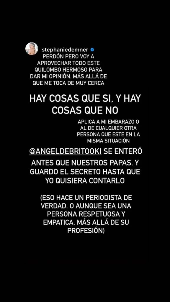 “Perdón pero voy a aprovechar todo este quilombo hermoso para dar mi opinión. Más allá de que me toca muy de cerca, hay cosas que sí y hay cosas que no. Aplica a mi embarazo o al de cualquier otra persona que esté en la misma situación. Angel De Brito se enteró antes de que nuestros papás y guardó el secreto hasta que yo quisiera contarlo”, contó Stephanie, quien vive en una casa de ensueño.
