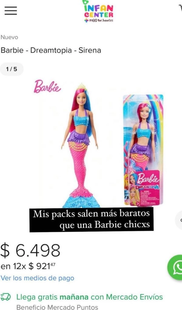 Si bien aún no trascendió el costo de su servicio, fue ella quien dio algunos indicios al asegurar: “Mis packs salen más baratos que una Barbie, chicxs”. Y acompañó su comentario con una imagen de la muñeca que en internet se consigue a 6.498 pesos argentinos.
