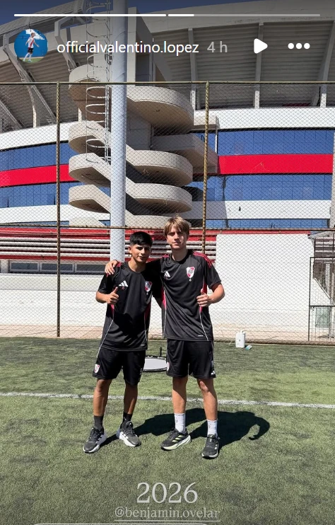 En la historia que compartió en Instagram, Valentino aparece entrenando en River Plate, con la indumentaria del club y el Monumental de fondo. A su lado, Benjamín Ovelar, compañero de las inferiores. La escena habla sola: alivio, alegría y la emoción intacta de volver a hacer lo que ama.