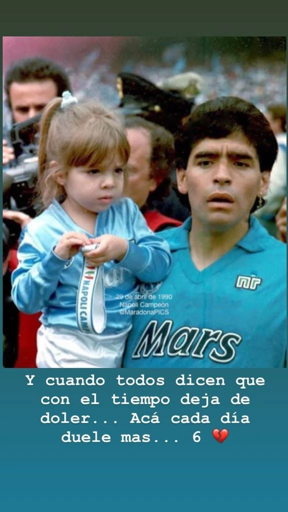 Para cerrar su homenaje, mostró una postal retro de ella a upa del futbolista mientras estaba jugando en Italia, y le dedicó unas dolorosas palabras: “Y cuando todos dicen que con el tiempo deja de doler… acá cada día duele más”.