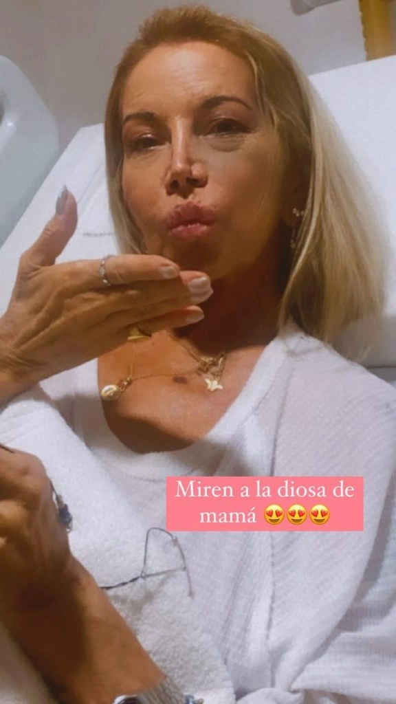 Publicó en sus historias una tierna postal donde se la ve a Sole muy recuperada, aunque todavía recostada. Con el rostro maquillado, la bijouterie puesta, las uñas de las manos pintadas y un dulce beso que Aquino le dedicó a la lente, Mica eligió esa imagen para mostrar cómo está su mamá, y la acompañó con unas amorosas palabras: “miren a la diosa de mamá”, que acompañó con tres emojis de caritas sonrientes con corazones.