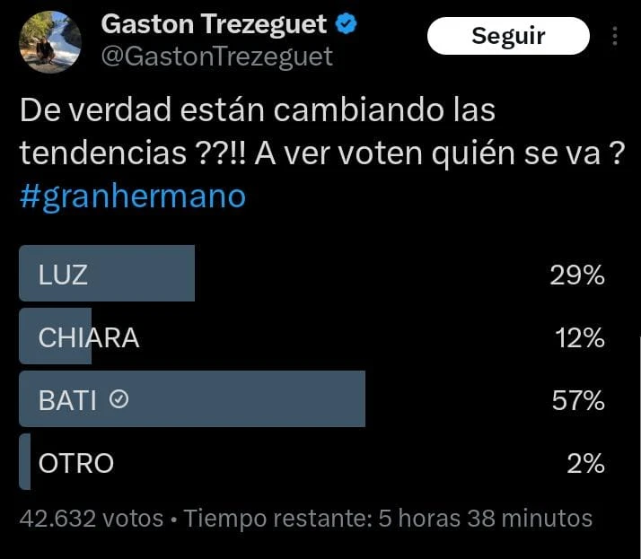 Y según las principales encuestas, en este caso la de Gastón Trezeguet, el que cuenta con todos los votos para irse es Bati con el 57%. Siendo una diferencia muy amplia la que se remarca en comparación al resto, todo indica que se irá hoy mismo por la puerta chica con su valija.