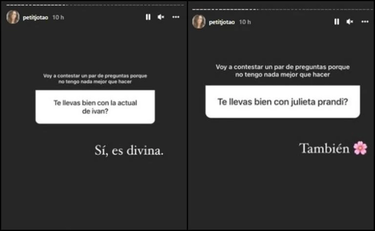 Hasta hace algunas horas que Julieta Ortega cortó con todos los rumores mediante su cuenta de Instagram. La actriz realizó una especie de pregunta y respuesta en sus redes donde le consultaron cómo se llevaba con la actual pareja de Iván Noble, a lo que respondió: "Bien, es divina". Fue entonces que le preguntaron si se llevaba bien con Prandi, muy sincera escribió: "También" junto al emoji de una flor.