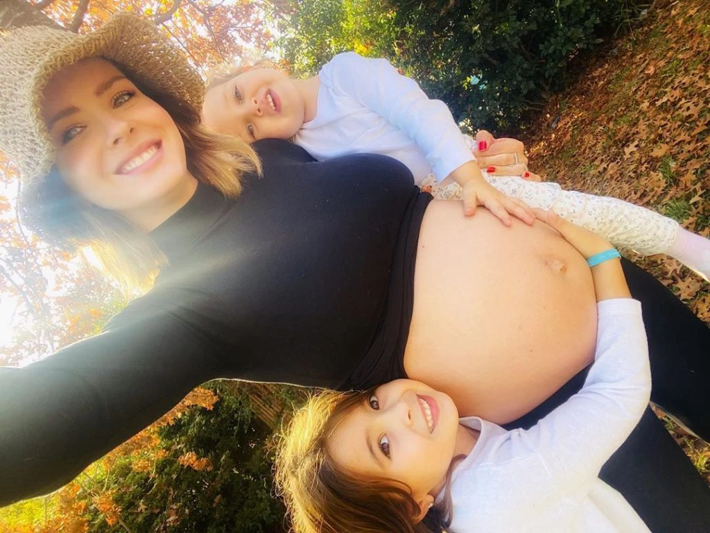 "Otoño enamor", escribió la actriz y mostró tiernas postales de si jardín lleno de hojas amarillas en una tarde soleada. A la foto con sus niñas le sumó una postal de cuerpo entero que deja ver su panzota.