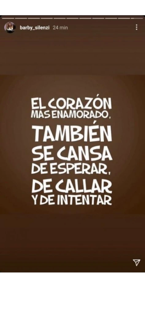 Sin embargo, en las últimas horas Barby volvió a sorprender a sus seguidores al publicar una contundente frase que levantó las sospechas de un nuevo mal momento de pareja: “El corazón más enamorado también se cansa de esperar, de callar y de intentar”.