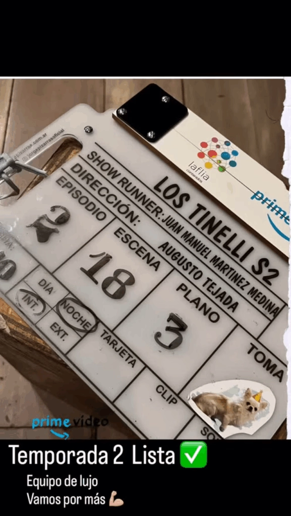 “Temporada 2 lista. Equipo de lujo, ¡vamos por más!”, escribió junto a un emoji de aprobación y un brazo en señal de fuerza, dejando en claro el esfuerzo colectivo detrás del proyecto y el entusiasmo por esta nueva etapa. Entre las imágenes, se destacó una claqueta de filmación con la inscripción “LOS TINELLI S2”, donde figuraban los nombres del showrunner Juan Manuel Martínez Medina y del director Augusto Tejada.
