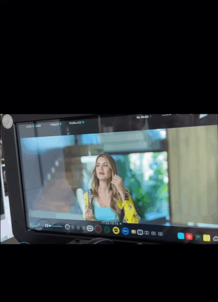 Capturada a través de un monitor profesional, se la pudo ver con una blusa celeste y un kimono amarillo estampado, en un ambiente moderno y luminoso que anticipa una estética cuidada y una fuerte presencia de las hermanas en esta temporada.