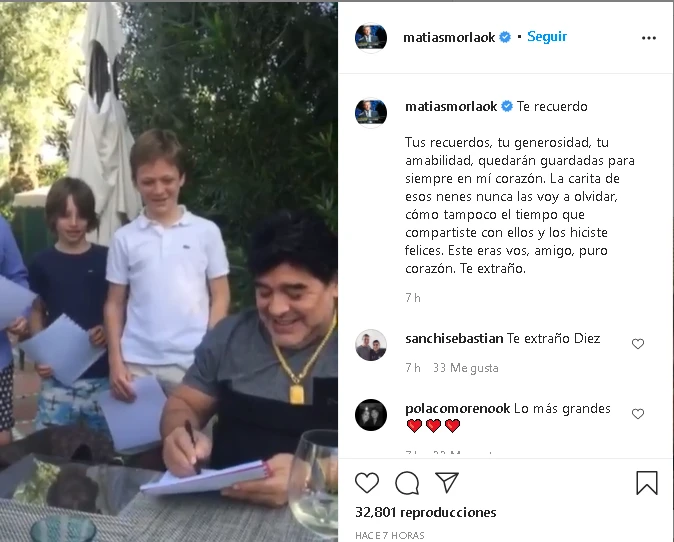 En esta oportunidad, Morla publicó en su muro de Instagram un video inédito de Diego Maradona. En él se lo ve acompañado por una de sus hermanas, Ana María, y su ex Rocío Oliva. Allí se ve al futbolista firmando autógrafos para un grupo de niños muy emocionados fotografiándose con el ídolo.