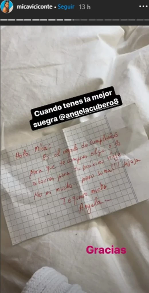 Ángela le dejó una dulce dedicatoria y Mica decidió compartirla con sus 2.5 millones de seguidores: "Es el regalo de cumpleaños para que te compres algo o lo ahorres para tu próximo viaje. No es mucho pero suma. Te quiero mucho", fueron las palabras que le dejó la mamá de Cubero y ella respondió: "Cuando tenés la mejor suegra".