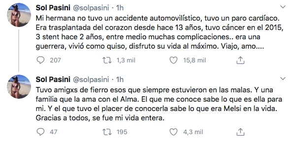 Sol siguió y puso los puntos a la historia. “Mi hermana no tuvo un accidente automovilístico, tuvo un paro cardíaco. Era trasplantada del corazon desde hace 13 años, tuvo cáncer en el 2015, 3 stent hace 2 años, entre medio muchas complicaciones. Era una guerrera, vivió como quiso, disfruto su vida al máximo. Viajo, amo…”, escribió.