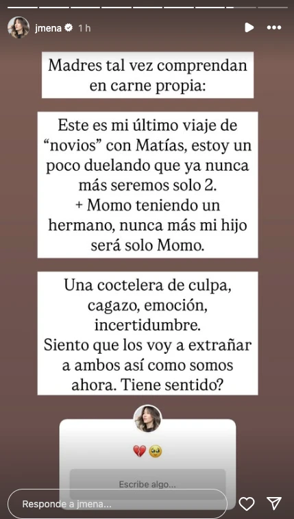 Estando en plena etapa de embarazo, contó en detalle lo que le cuesta realizar este viaje. Si bien estará acompañada de su bebé y Matías, no es nada fácil tomar distancia de su hijo, que para Jimena es el gran compañero de vida que tiene.