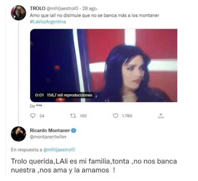 Molesto con lo publicado en el posteo de la usuaria, Montaner reaccionó y le contestó con virulencia. "Querida, Lali es mi familia, tonta. Nos ama y la amamos", le dedicó Ricardo la respuesta directa. Pero eso no fue todo...