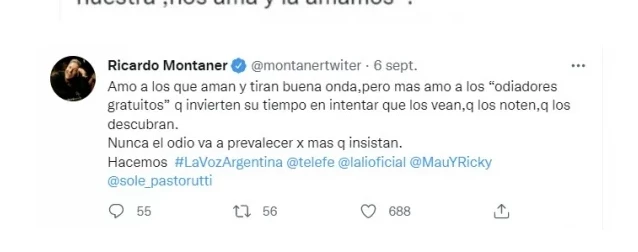 recordemos que tiempo atrás, sin vueltas, Ricardo también le contestó en redes a Mercedes Morán cuando la actriz dijo que no le gustaban los clanes en tevé, en referencia a que el cantautor trabaja en el certamen de talentos con sus dos hijos, Mau y Ricky. A la hora de reaccionar, a Montaner no le tiemblan las teclas.