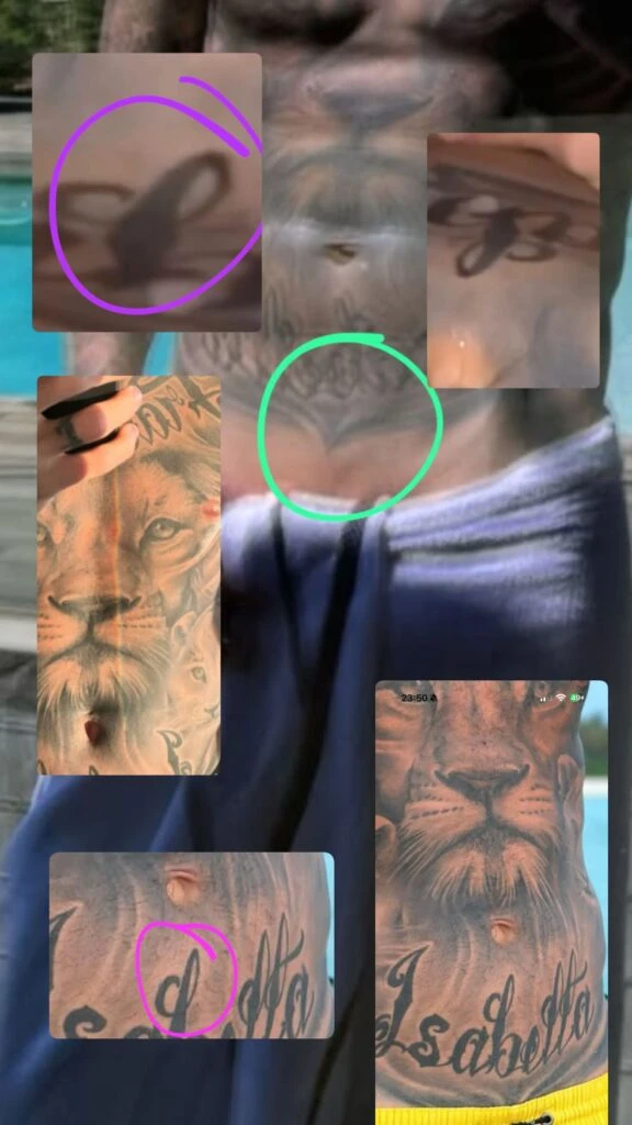 Es que ahí, entre la tinta negra, el león gigante que decora su cuerpo y los firuletes del nombre de su hija menor Isabella están las claves que indicarían si el video que subió Natasha, en tiempos de deep fake, es fidedigno o no.