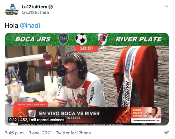 "Ante un comentario mío sobre el final de la transmisión del sábado: no quise ofender a o agredir a nade en particular y lamento si así fue interpretado. En 30 años con River, mi audiencia y mis colegas saben de mi respeto a jugadores e hinchas de Boca" manifestó el relator, con una explicación que no convenció a nadie.