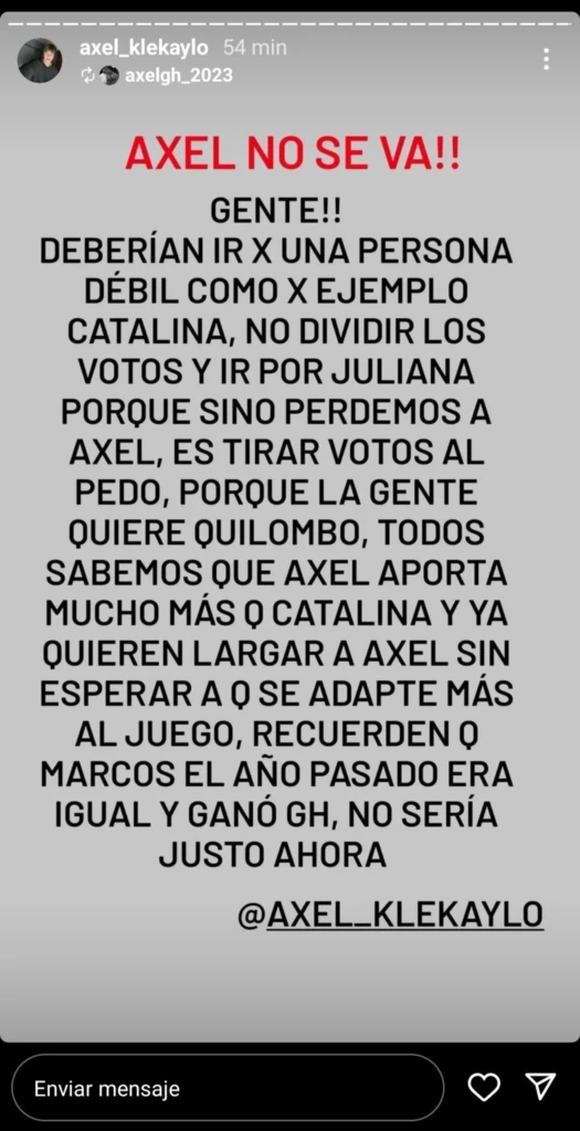 "¡Gente! Deberían ir por una persona débil como Catalina, no dividir los votos e ir por Juliana porque sino perdemos a Axel. Es tirar votos al pedo, porque la gente quiere quilombo”, decía el polémico comunicado que escribieron sus personas más allegadas.