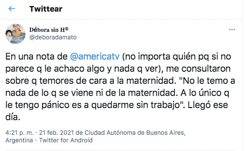 “En una nota de América (no importa quién porque si no parece que le achaco algo y nada que ver), me consultaron sobre qué temores tenía de cara a la maternidad. ‘No le temo a nada de lo que se viene ni de la maternidad. A lo único que le tengo pánico es a quedarme sin trabajo’. Llegó ese día”, compartió.