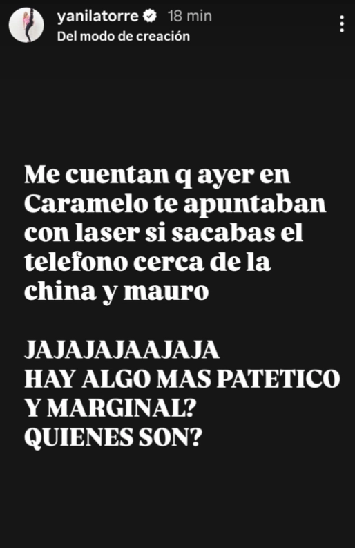 De acuerdo al mismo relato, la joven involucrada habría logrado registrar lo ocurrido: “Al parecer la damnificada sacó el teléfono y registró el mal momento”. Yanina Latorre, por su parte, contó el insólito operativo que realizaron en el boliche a pedido de Icardi, que sostiene esta versión. "Me cuentan que ayer en Caramelo te apuntaban con láser si sacabas el teléfono cerca de la China y Mauro. ¿Hay algo más patético y marginal? ¿Quiénes son?", dijo en sus historias e IG.