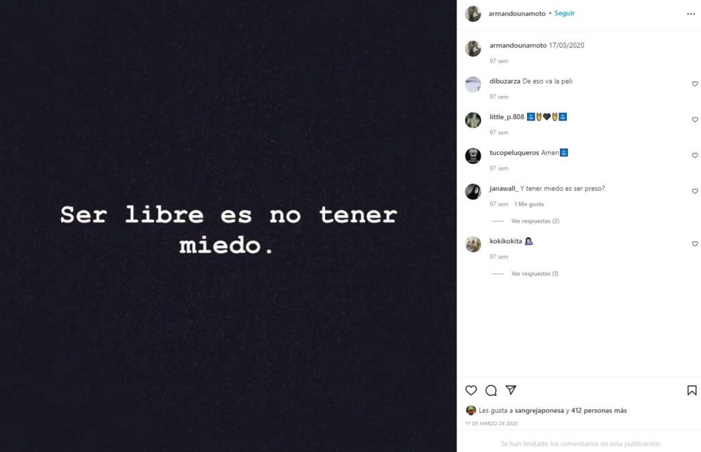 En marzo de 2020 cuando ya estaba en la dulce espera con el chileno, Suárez dejó su "like" en un llamativo mensaje que compartió su actual novio. "Ser libre es no tener miedo", dice la frase que compartió en su feed hace dos años.