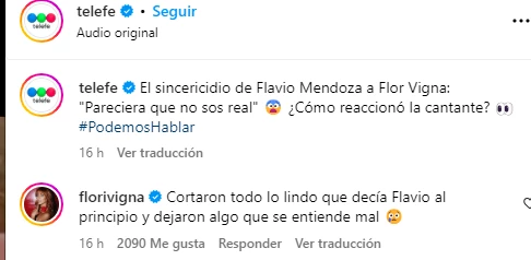 "Cortaron todo lo lindo que decía Flavio al principio y dejaron algo que se entiende mal", escribió la cantante muy enojada en la cuenta de Instagram de Telefe.