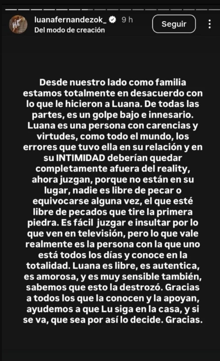 La escena generó tanta repercusión que, horas después, la familia de la participante publicó un fuerte comunicado en sus redes. “Desde nuestro lado como familia estamos totalmente en desacuerdo con lo que le hicieron a Luana. De todas las partes, es un golpe bajo e innecesario”, expresaron, cuestionando la decisión del reality de exponer a la chica.