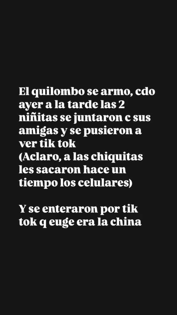 Yanina Latorre, panelista de LAM, reveló que las niñas se enteraron de todo de una manera inesperada. “Ellas no sabían que la China era la China. La llamaban ‘Euge, la amiga de papá que tiene dos hijos: Amancio y Magnolia’. El problema se armó cuando vieron TikTok con sus amigas y se enteraron que Euge era la famosa China Suárez”, explicó.