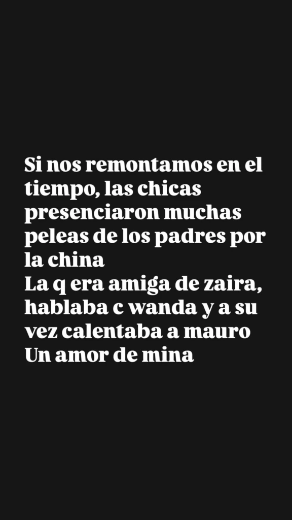 La panelista también apuntó contra Mauro y la actriz por no pensar en los niños. “Él está enojado y despechado por Wanda, pero la China, ¿piensa? Cómo le gusta la guita. No entiendo por qué esta gente no piensa en los hijos. De la nada se van a vivir juntos con los chicos. ¿No piensan en ellos?”, reflexionó en sus redes.